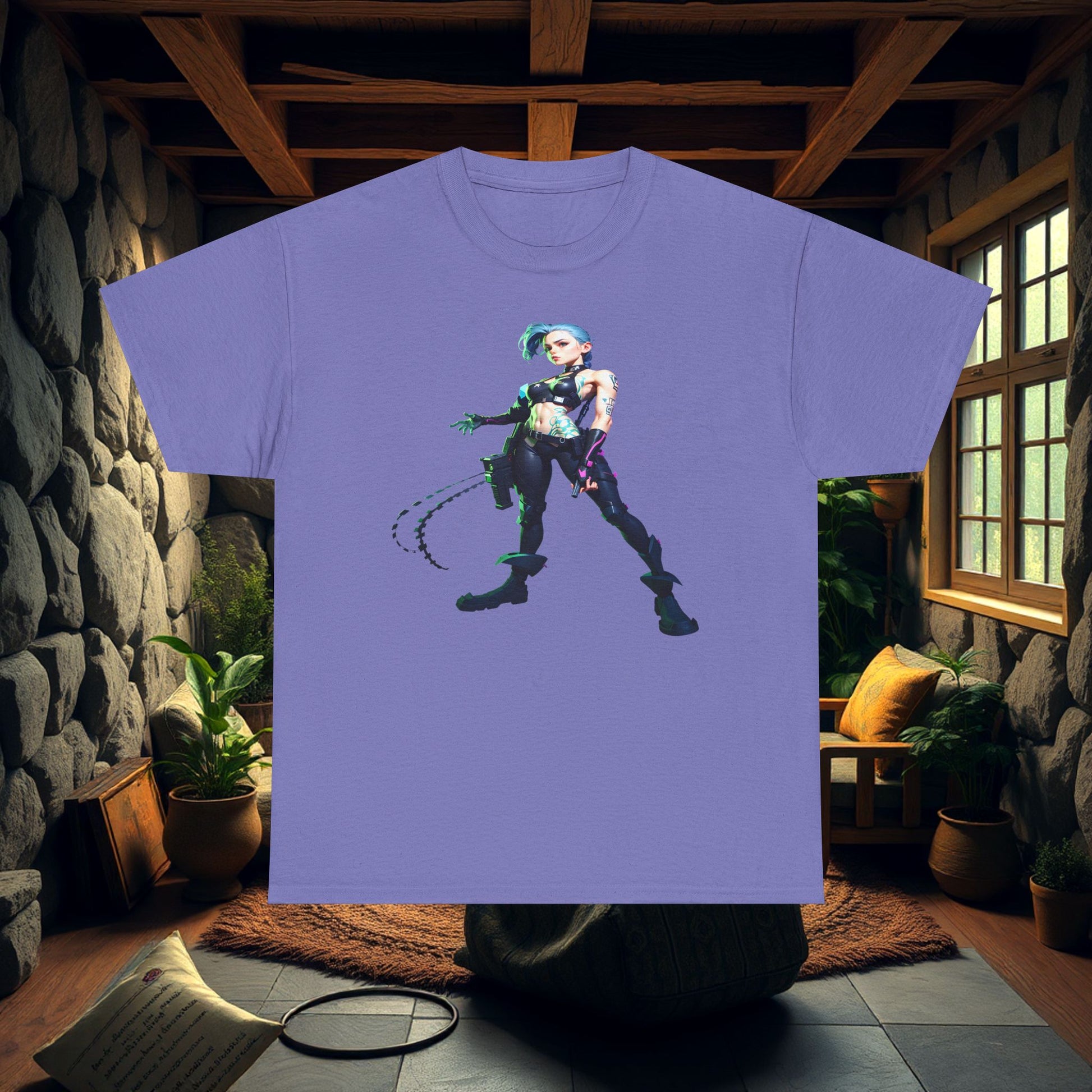 Arcane inspired Jinx Cotton Tee with anime graphic design, perfect for fans of Arcane. This unisex heavy cotton T-Shirt offers a comfy, relaxed fit with a neat crew neckline, suitable for casual or semi-formal occasions. Made from sustainable, durable fabric, this tee is ideal for year-round comfort.